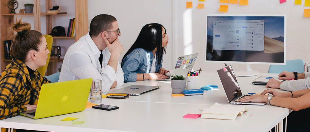 Computer monitor with people icons representing virtual event marketing and online conference services.